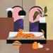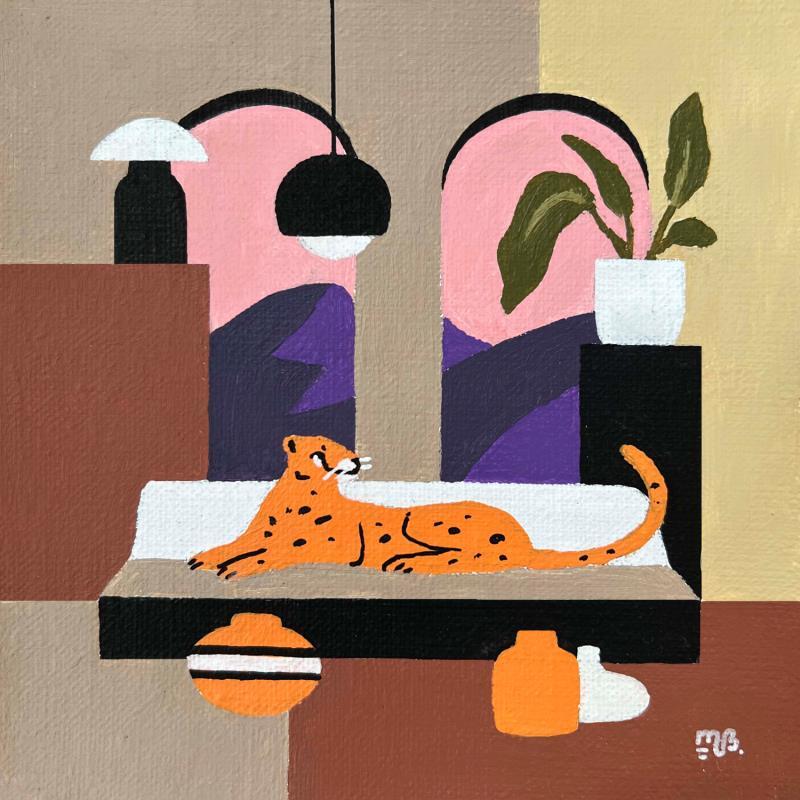 L'artiste a utilisé la technique Acrylique pour créer cette peinture petit format sur Toile de style Art naïf sur les thèmes Animaux, Natures mortes, Urbain.