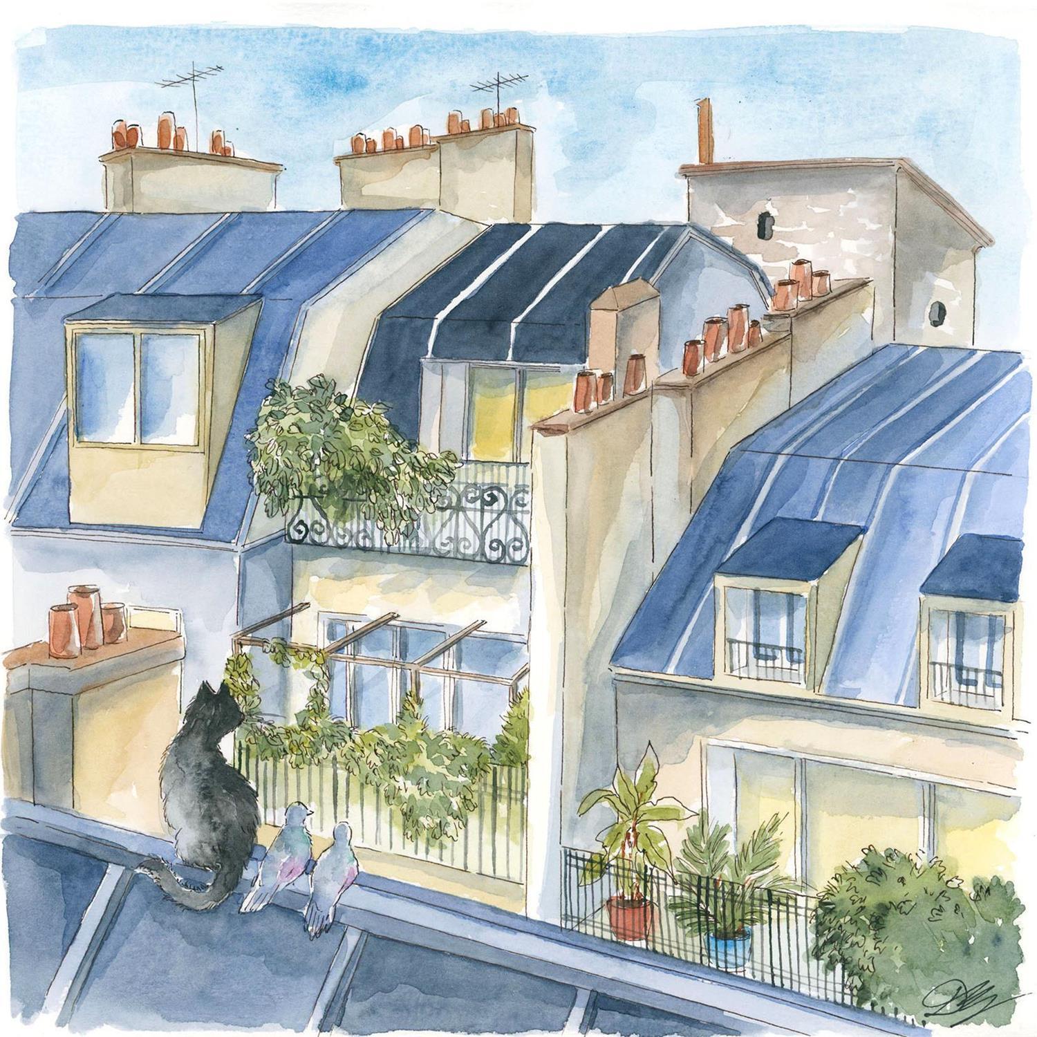 L'artiste a utilisé la technique Aquarelle pour créer cette peinture petit format sur Papier de style Art naïf sur les thèmes Animaux, Urbain.