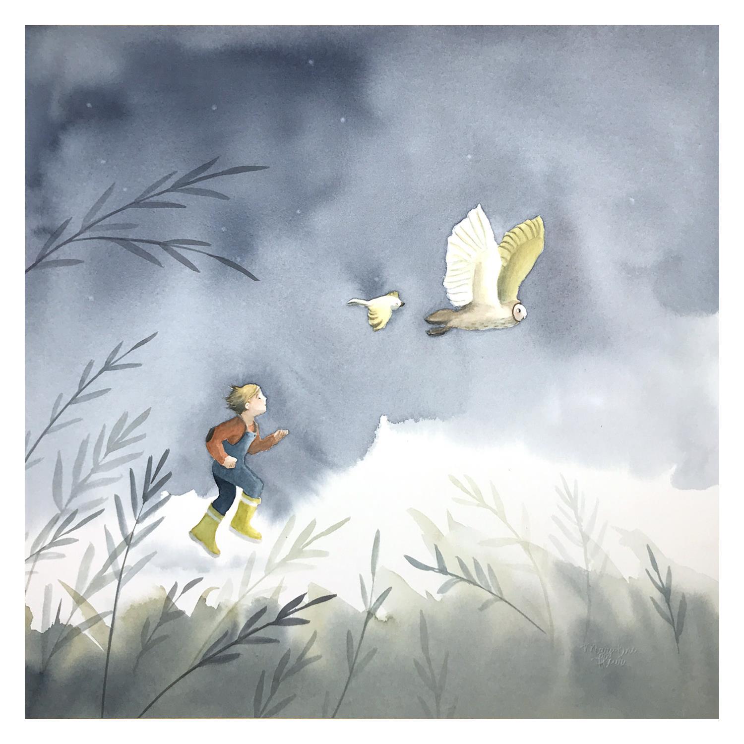 Chouette coursePeinture Chouette course par Marjoline Fleur | Tableau Art naïf Nature Animaux Enfant Aquarelle