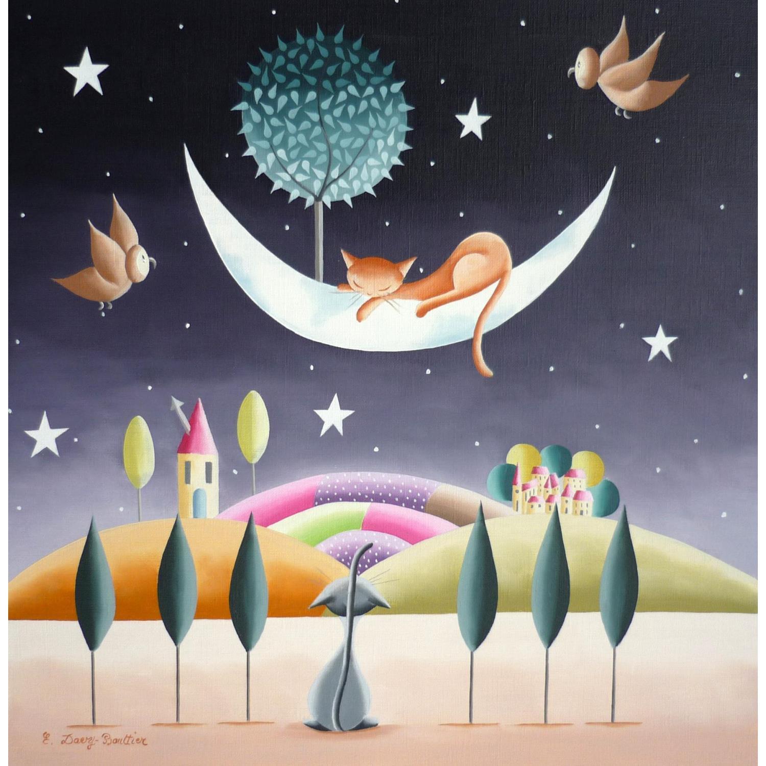 Peinture Sérénade sous la lune par Davy Bouttier Elisabeth | Tableau Art naïf Nature Scènes de vie Huile