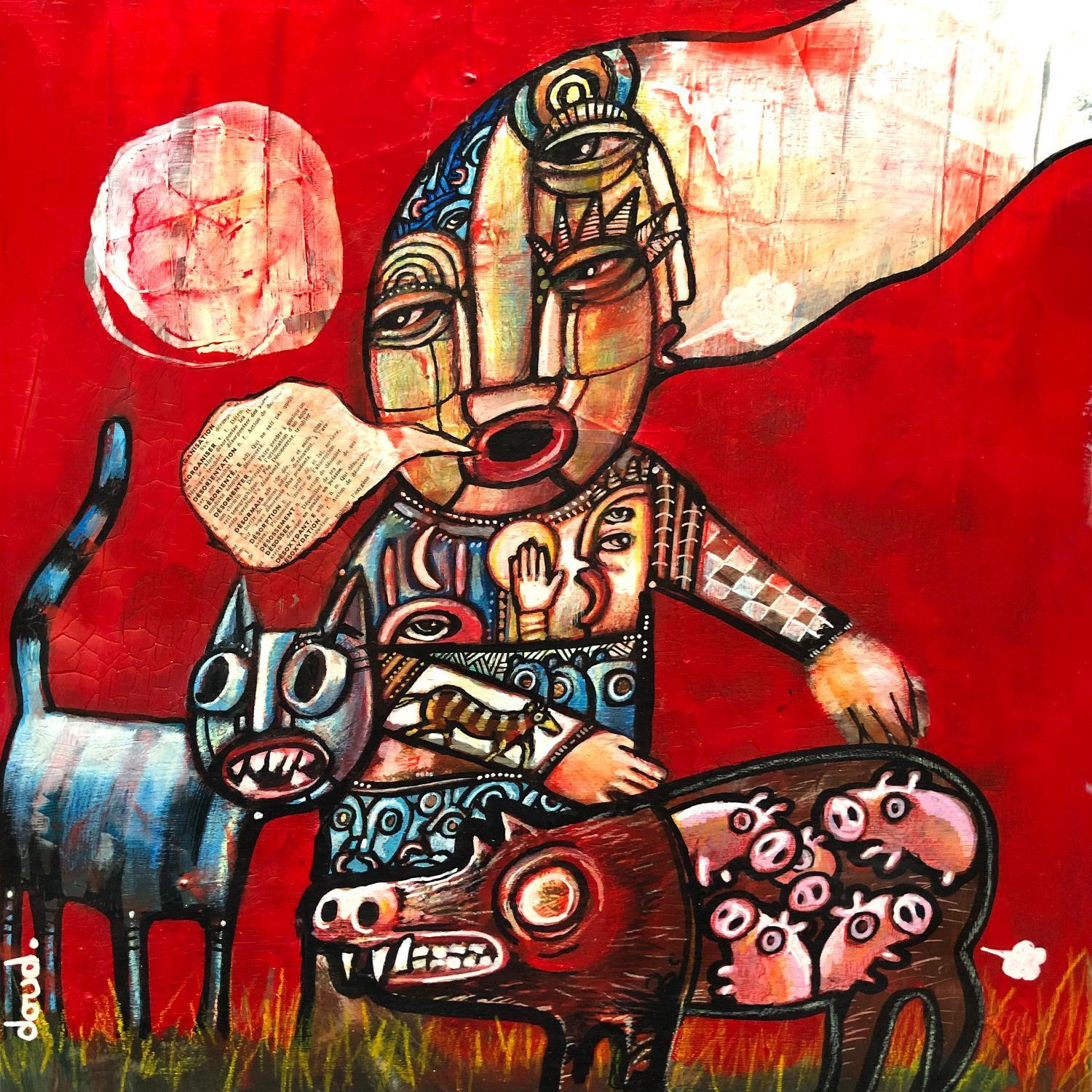 L'artiste a utilisé la technique Acrylique pour créer cette peinture petit format sur Métal de style Art Singulier sur les thèmes Animaux, Nu, Scènes de vie.