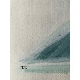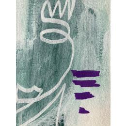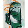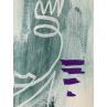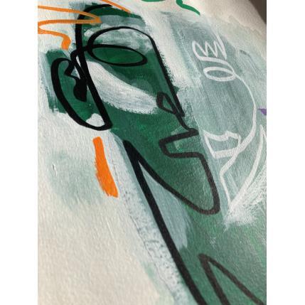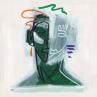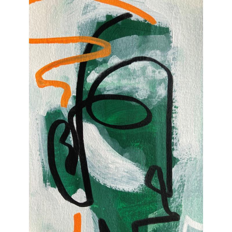 Un visage verdâtre qui sort du brouillard blanche, avec une finition assez chaotique et organique. Du côté gauche il y a des lignes plus lourdes et épaisses en noir et une autre en or, du côté droit elles sont plus légères et minces en blanc avec d’autres lignes en turquoise et violet.