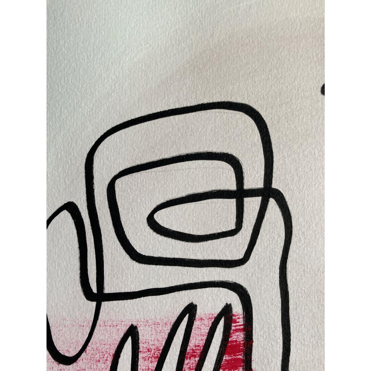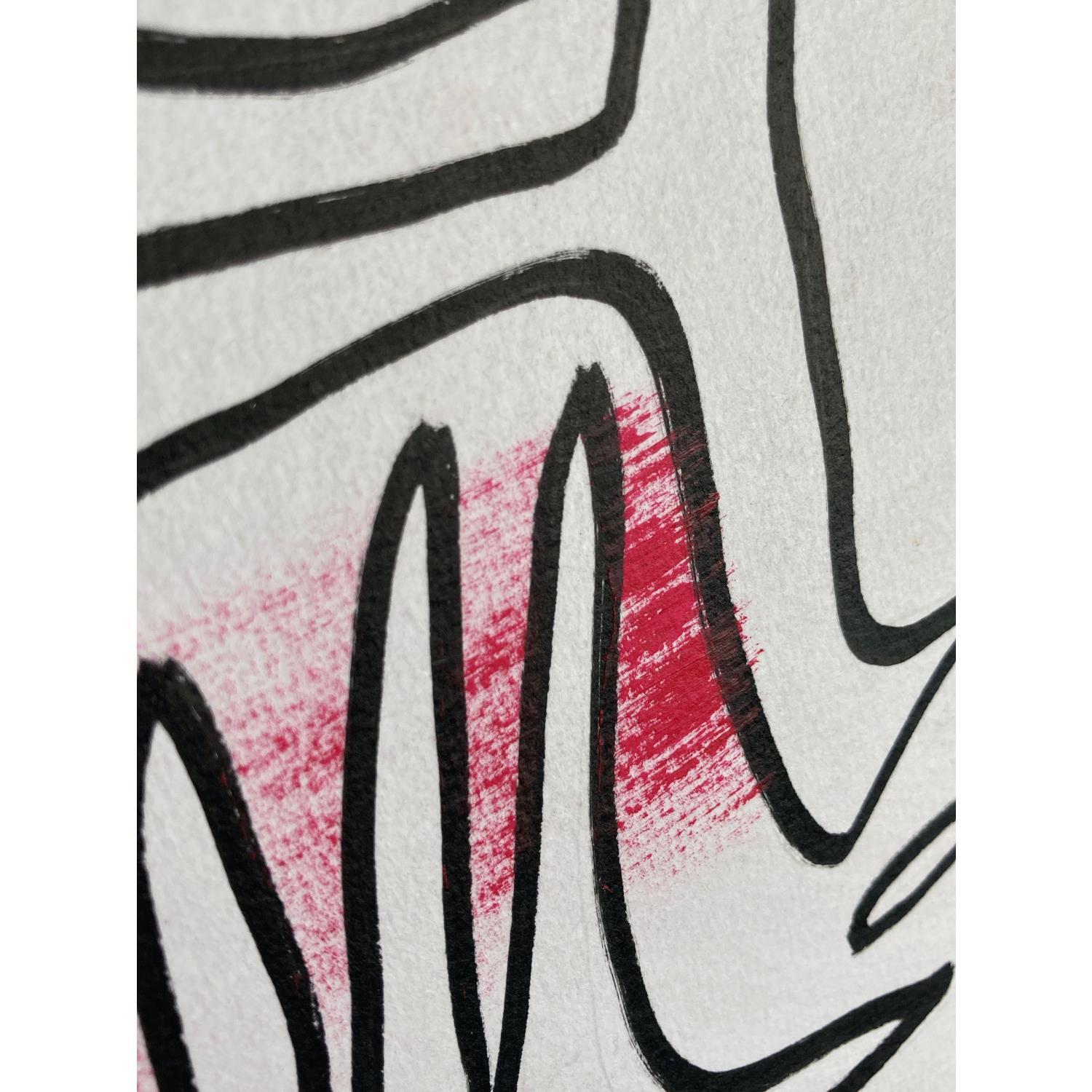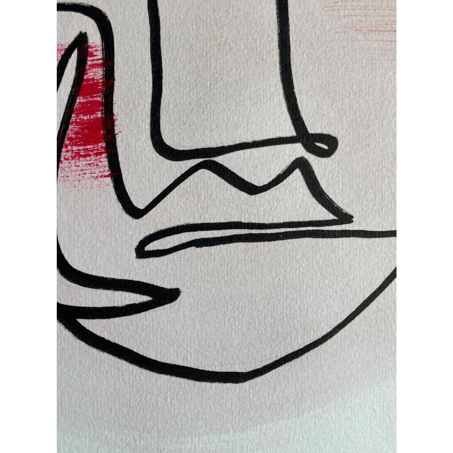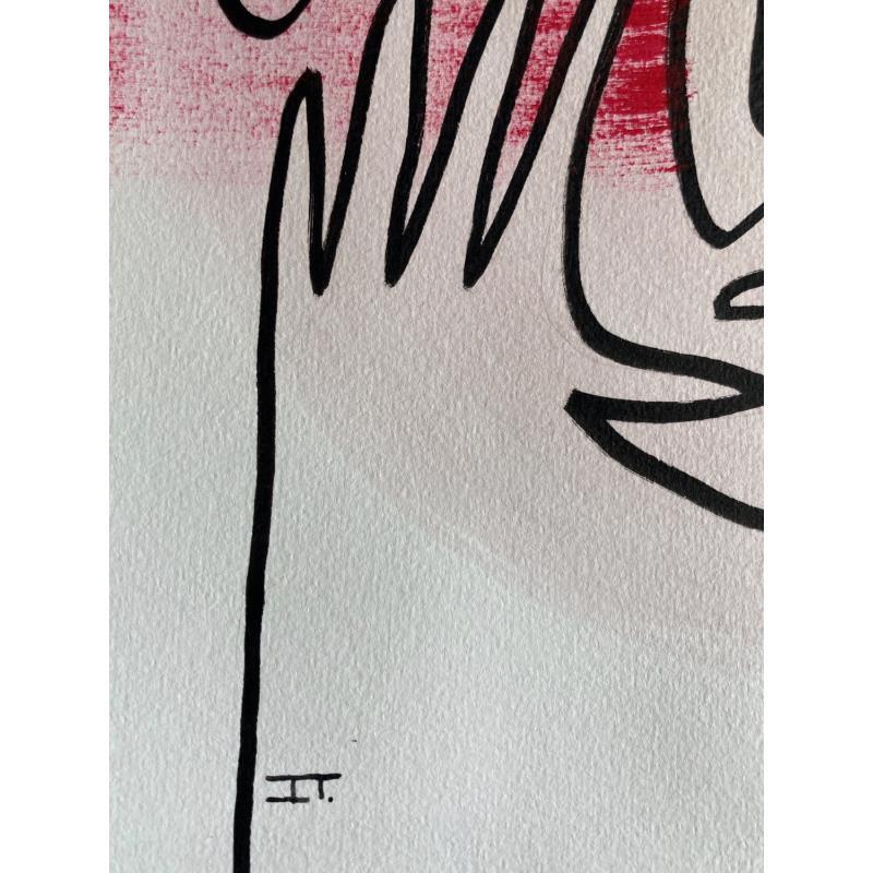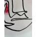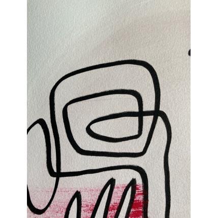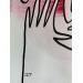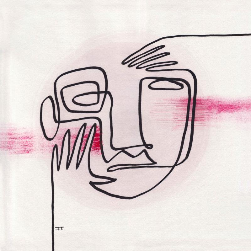 Cette œuvre d’art unique, est un portrait d’une personne de face faite d’une seule ligne continue noire en Posca, Nous voyons ses deux mains toucher le visage au centre. Il y a deux coups de pinceau de couleur rose sec au niveau des pommettes.
