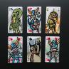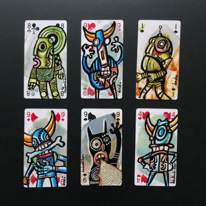 Oeuvre composée de 6 véritables cartes de tarot, complètement détournées par l'artiste et collées sur un passe noir. Laissez vous emporter dans un univers Doudoudinesque d'une grande richesse dans lequel l'humour est omniprésent. Parce que sinon ce ne serait pas drôle.