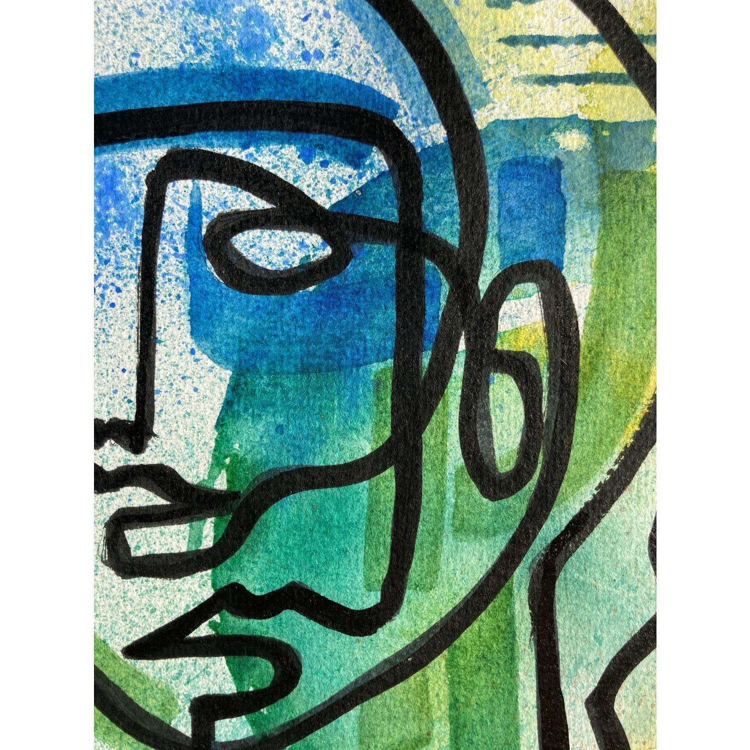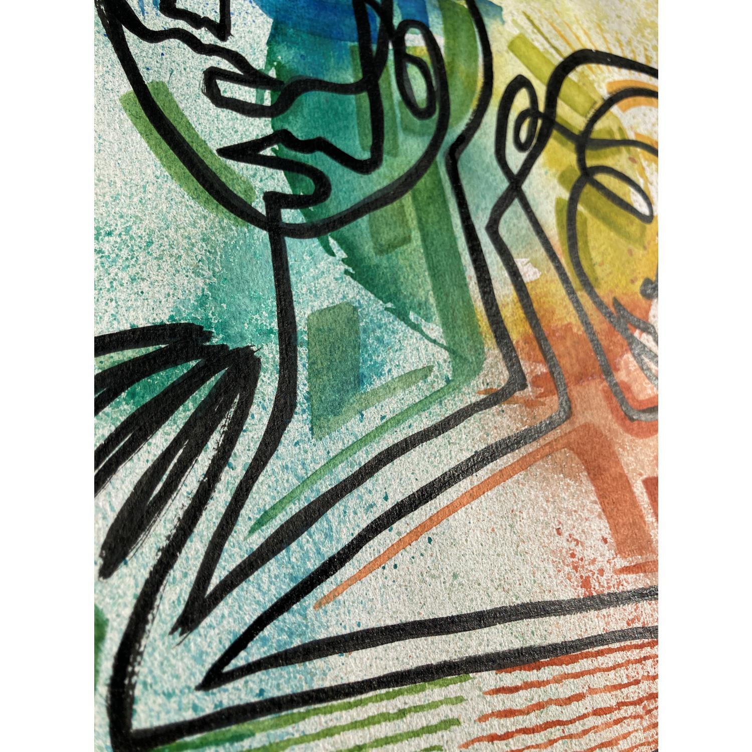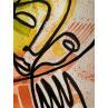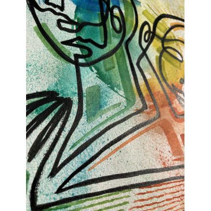 Dans cette œuvre d’art unique et originale, nous pouvons voir deux visages comme image principale et deux mains en bas à l’extérieur, le tout fait d’une seule ligne continue en noir. En arrière-plan, il y a un cercle multicolore au centre qui tache vers l’extérieur de différentes couleurs comme le bleu en haut à gauche, le vert en bas à gauche, le rouge en bas à droite et le jaune en haut à droite. Ce sont des couleurs qui tachent les lignes à l’intérieur des personnages en leur donnant un peu de mouvement.