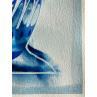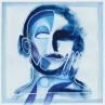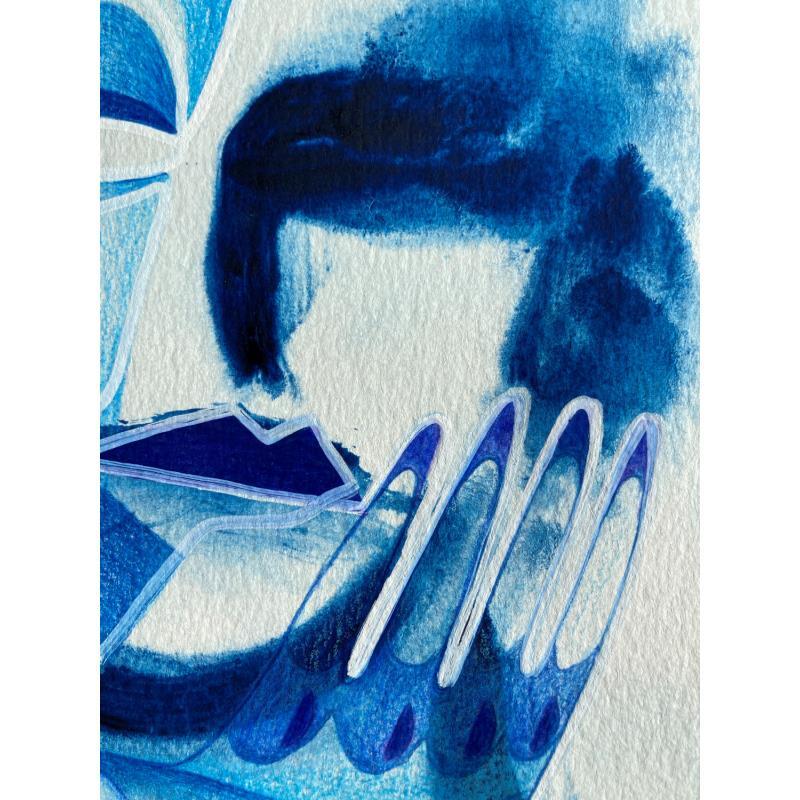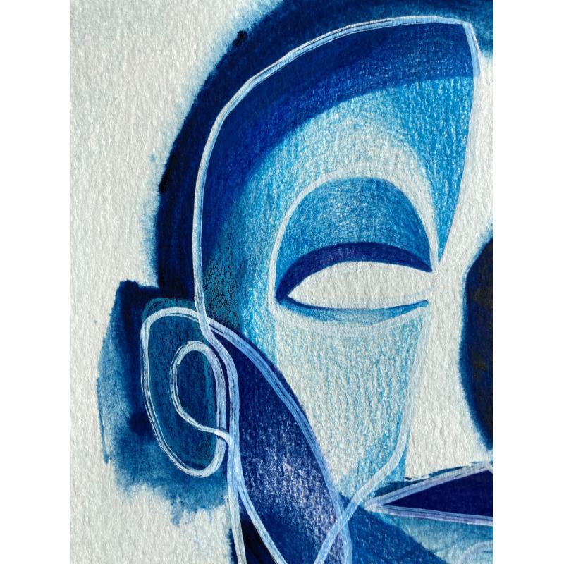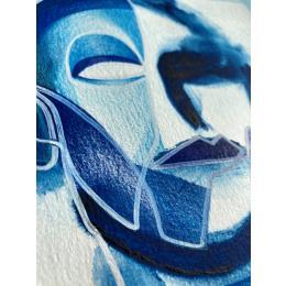 Cette œuvre d’art unique, est un portrait d’une personne de face avec une seule main sur sa droite et faite d’une seule ligne continue blanche en Posca, rempli de crayons de couleur créant des volumes de visage comme un masque avec une texture très différente à l’arrière-plan donnant une sensation de profondeur de champ. Généralement basé sur des couleurs bleues et violettes.