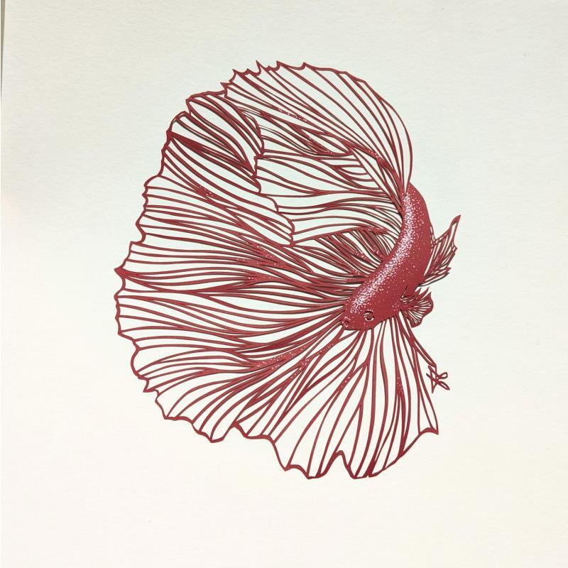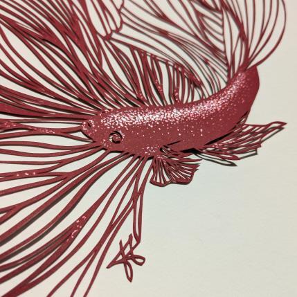 L'artiste a utilisé la technique papier découpé pour créer ce petit format au style singulier, et l'a ensuite colorisée par petites touches de peinture irisée pour lui donner du relief.