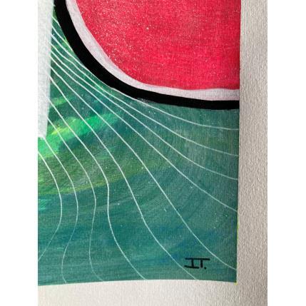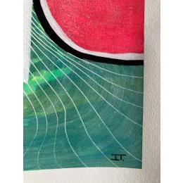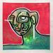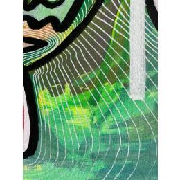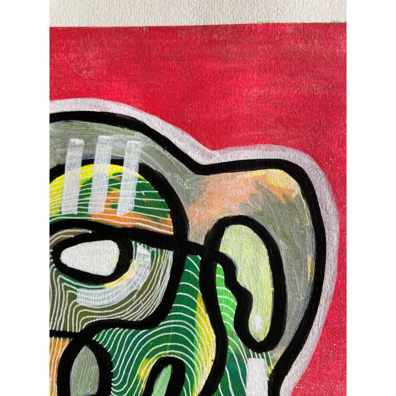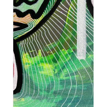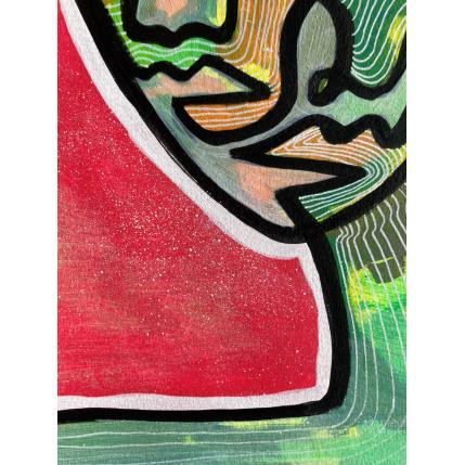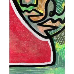 C’est une œuvre unique où il y a un grand contraste de couleurs entre le fuchsia de fond et le vert du personnage qui regarde à gauche, un personnage étrange avec deux bouches et deux nez fait d’une seule ligne continue en noir et beaucoup de texture à l’intérieur. Il y a une ligne blanche qui sépare un peu le contraste des deux.