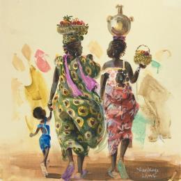 Cette oeuvre d'art contemporain unique et originale "Deux Dames et Enfants" a été réalisée par l'artiste contemporain Lama Niankoye.