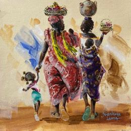 Cette oeuvre d'art contemporain unique et originale "Deux Dames et Enfants" a été réalisée par l'artiste contemporain Lama Niankoye.