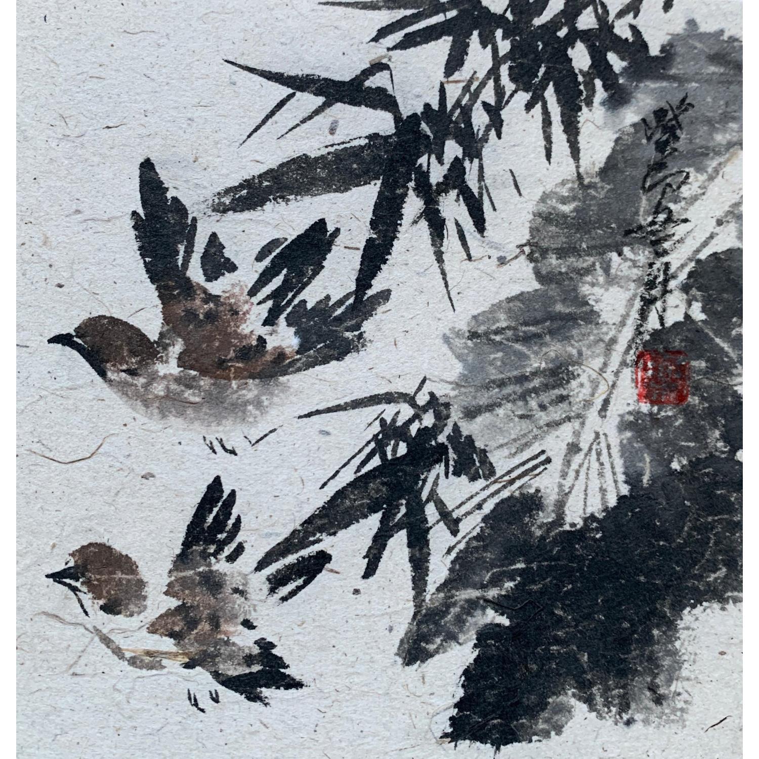 L'artiste a utilisé les techniques Aquarelle, Encre pour créer cette peinture petit format sur Papier de style Figuratif sur les thèmes Animaux, Nature, Noir & blanc.
