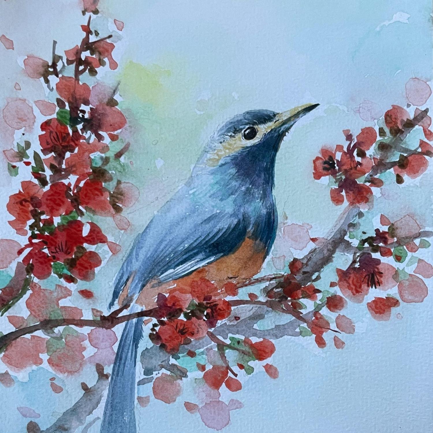 L'artiste a utilisé les techniques Aquarelle, Encre pour créer cette peinture petit format sur Papier de style Figuratif sur les thèmes Animaux, Nature.