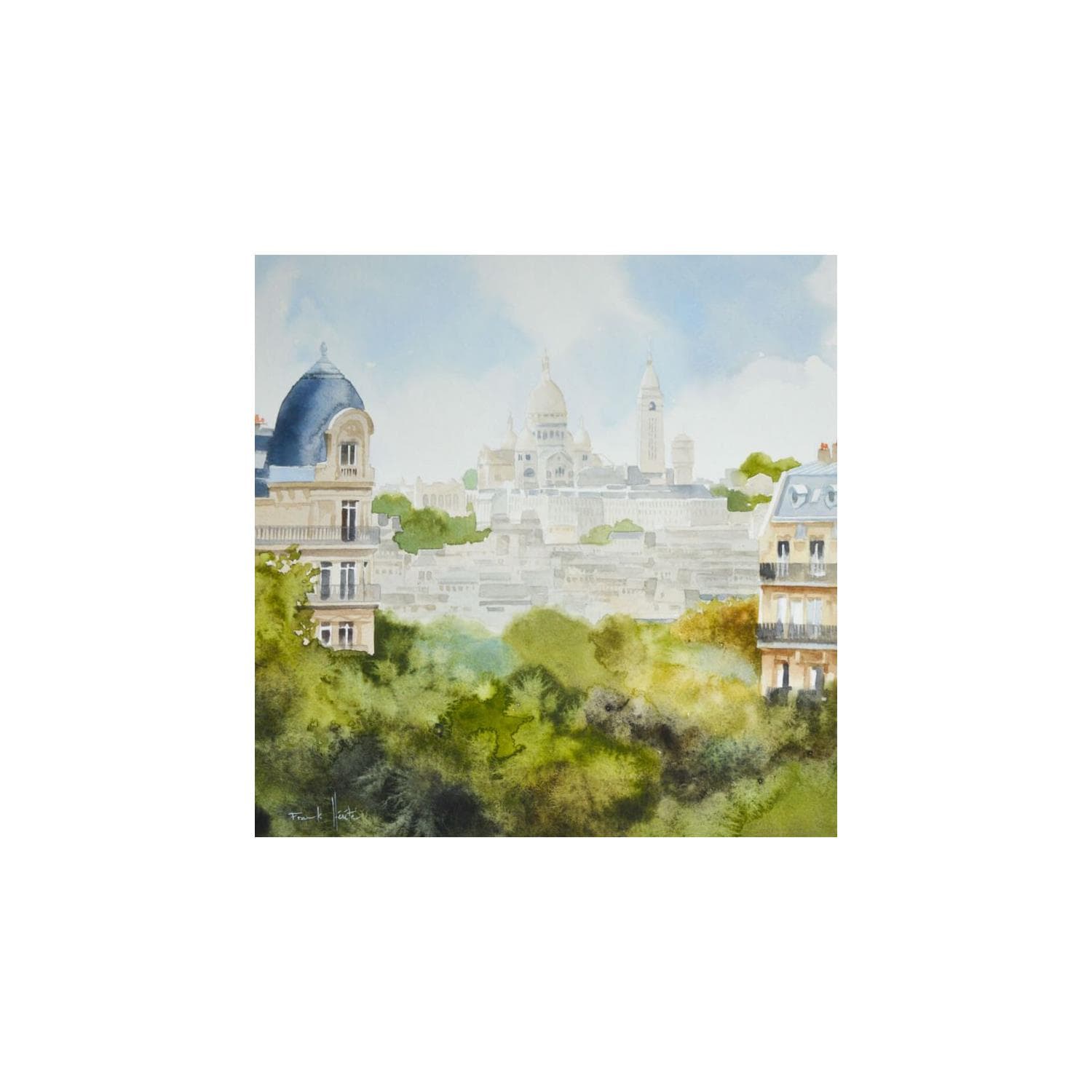 Issu d’une formation à la prestigieuse école d’illustration Émile Cohl, Frank Hérété travaille pendant dix-huit ans comme directeur artistique dans une agence de communication. En 2013, il se consacre pleinement à la peinture et sa longue pratique de l’huile le pousse à s’orienter vers la figuration. Il découvre l’aquarelle et devient l’un des peintres les plus prolifiques de la région lyonnaise. Son travail de portraitiste lui vaudra également de gagner plusieurs prix. Il peint principalement en extérieur, souvent sur les berges de la Saône qui constituent son atelier. Toujours à l’affût de nouveaux sujets, il remplit de nombreux carnets d’études et de détails pris sur le vif, et sublime inlassablement sa ville dans ses œuvres époustouflantes de vie.