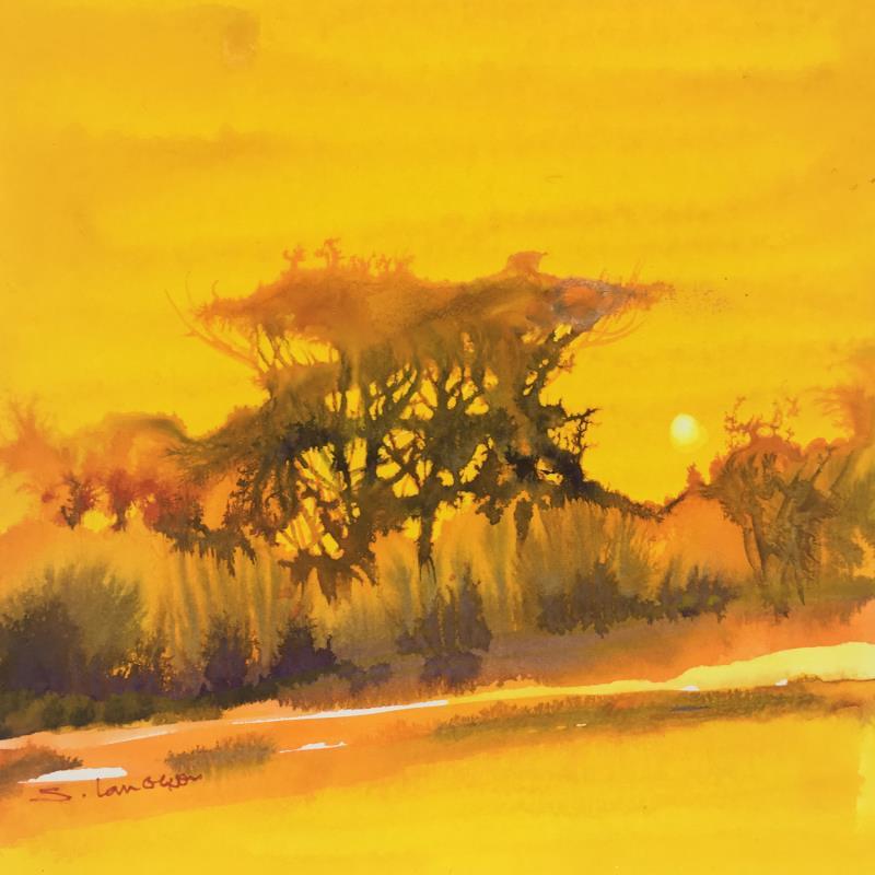 Coucher de soleil jaunePeinture Coucher de soleil jaune par Langeron Stéphane | Tableau Figuratif Matiérisme Paysages Aquarelle