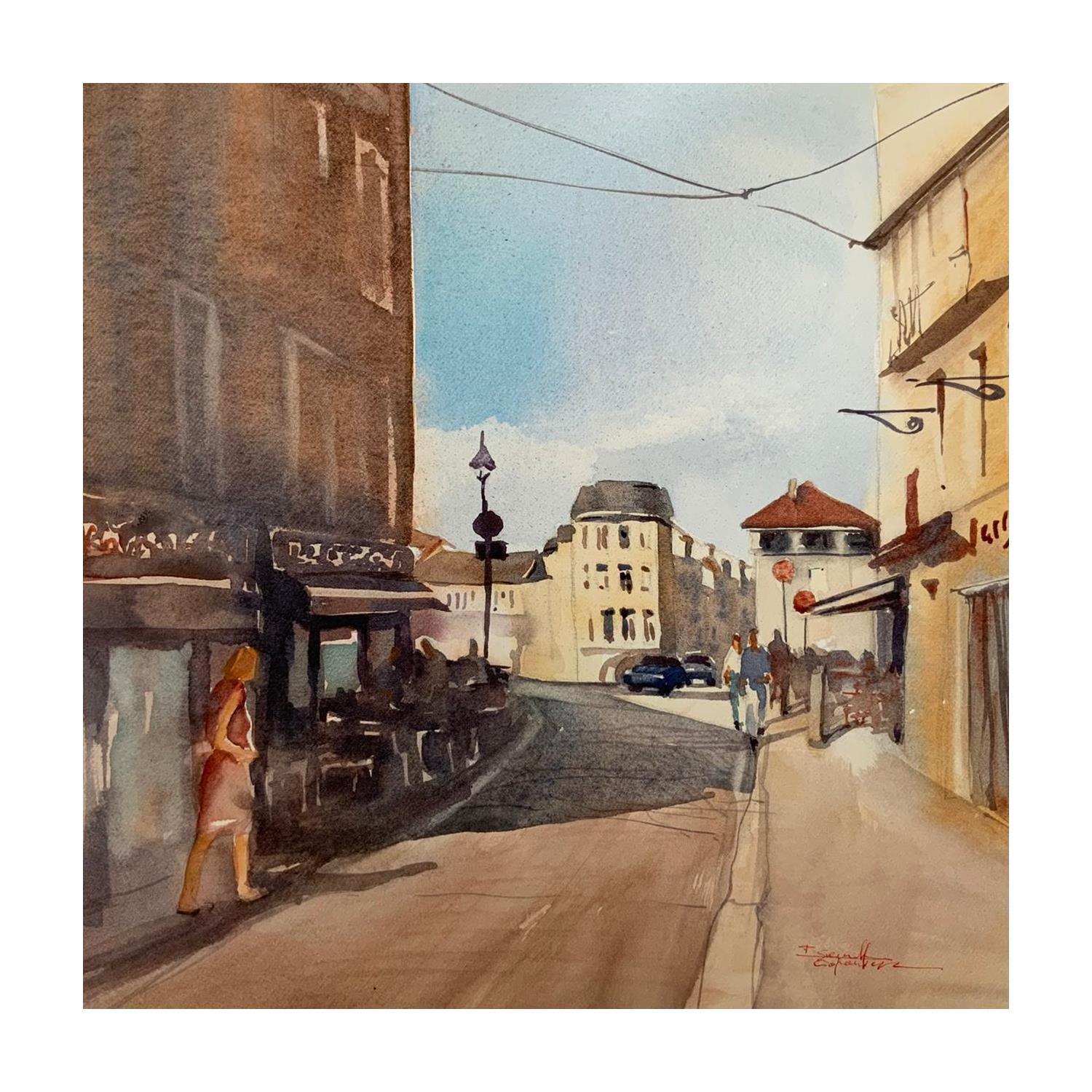 L'artiste a utilisé la technique Aquarelle pour créer cette peinture petit format sur Papier de style Figuratif sur le thème Urbain.