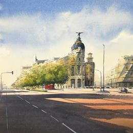 Peinture Red tram par Min Jan | Tableau Figuratif Urbain Aquarelle