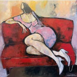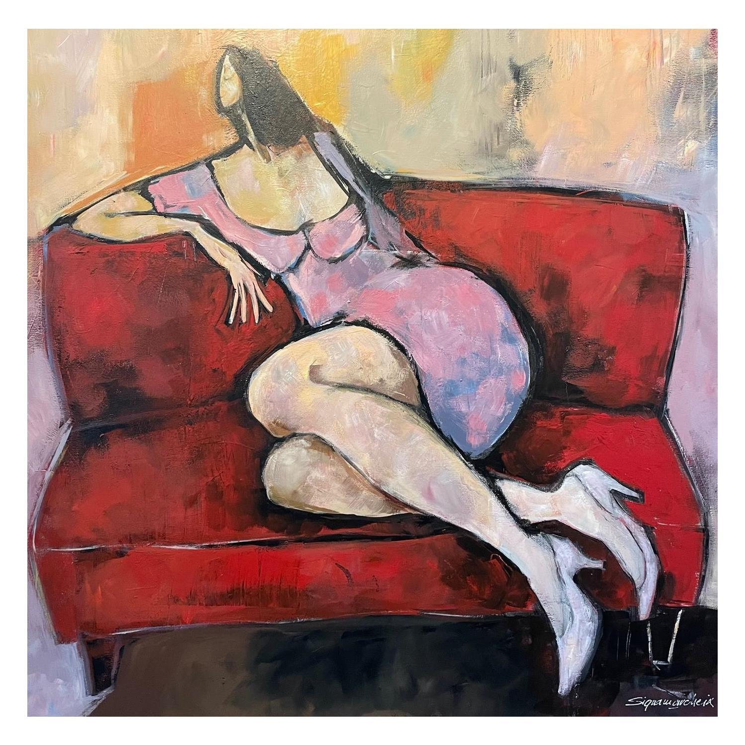 Cette oeuvre d'art contemporain unique et originale "Penelope (femme sur canapé rouge) " a été réalisée par l'artiste contemporain Signamarcheix Bernard.