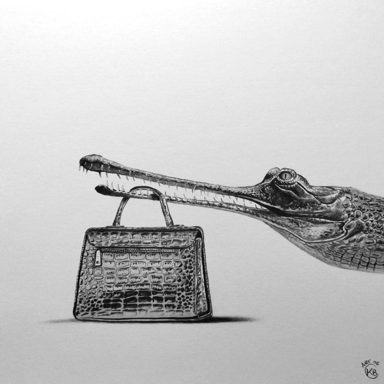 Peinture Gavial par K'Arts | Tableau Figuratif Scènes de vie Animaux Noir & blanc Fusain