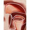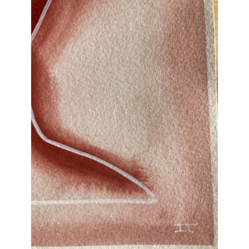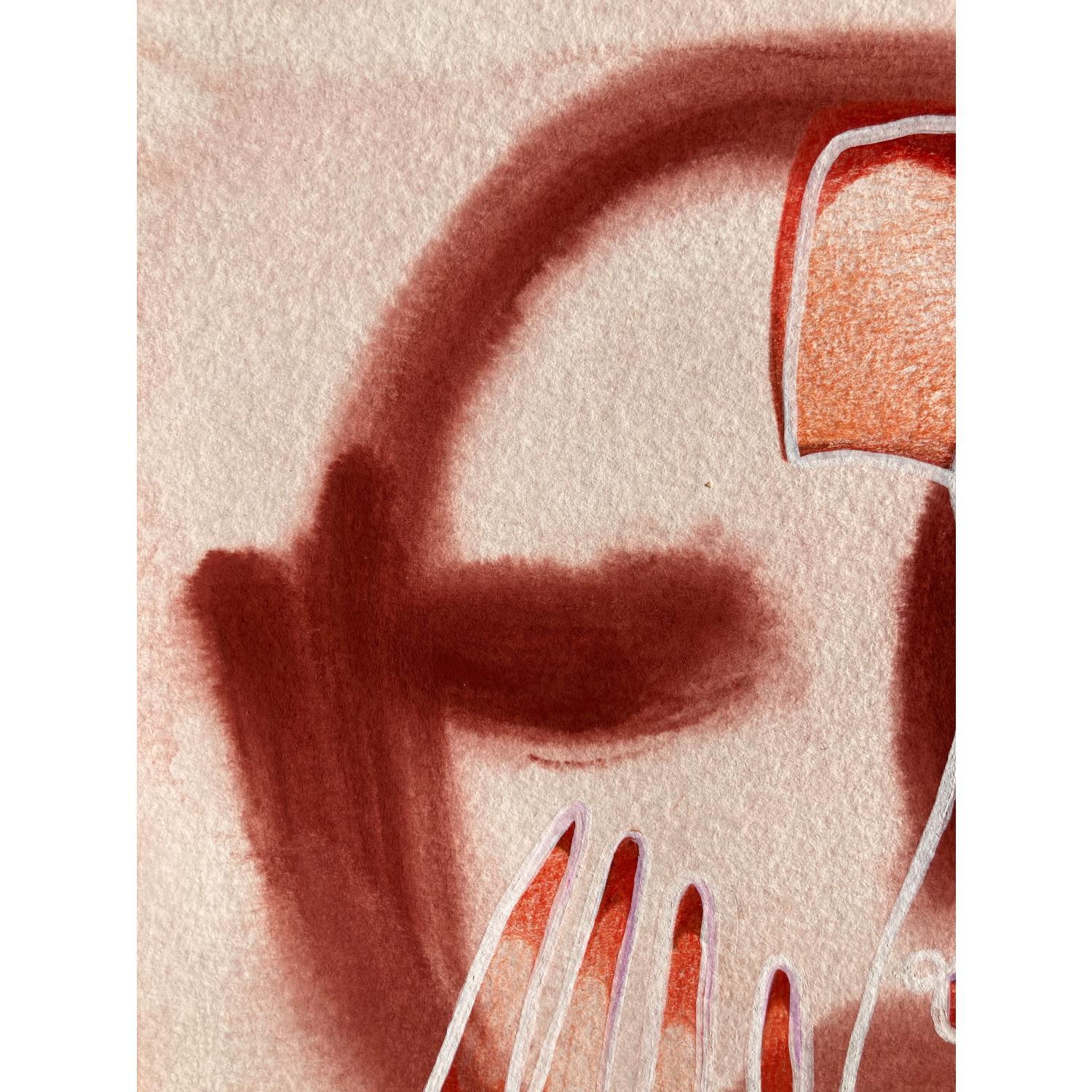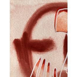 Cette œuvre d’art unique, est un portrait d’une personne de face avec une seule main sur sa gauche et faite d’une seule ligne continue blanche en Posca, rempli de crayons de couleur créant des volumes de visage comme un masque avec une texture très différente à l’arrière-plan donnant une sensation de profondeur de champ. Généralement basé sur des couleurs rouges et oranges