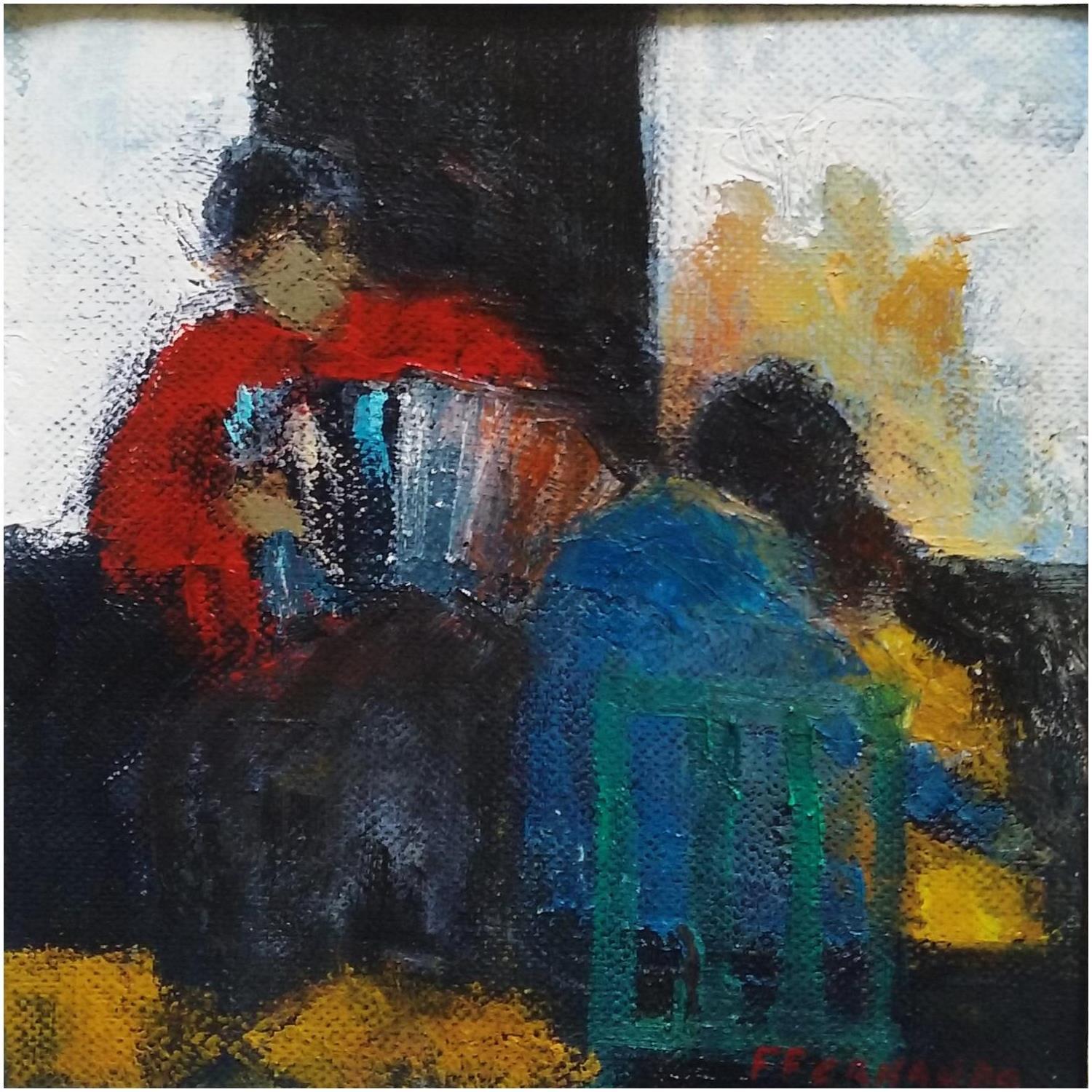 L'artiste a utilisé la technique Huile pour créer cette peinture petit format sur Toile de style Figuratif sur les thèmes Enfant, Scènes de vie.
