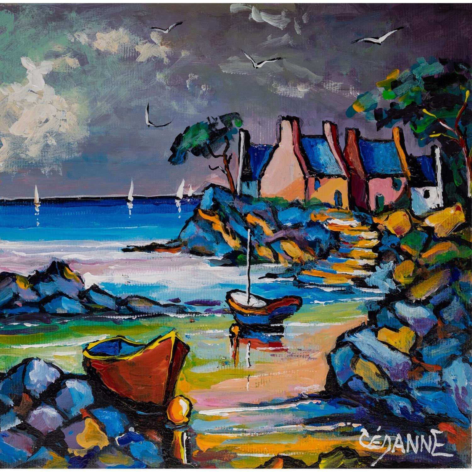 Cette œuvre d'art contemporain unique et originale, de style figuratif, a été réalisée par le peintre Cèdanne. L'artiste a utilisé différentes techniques pour créer cette peinture petit format, et traiter avec le style singulier qui lui est propre, cette vue de Bretagne à marrée basse.