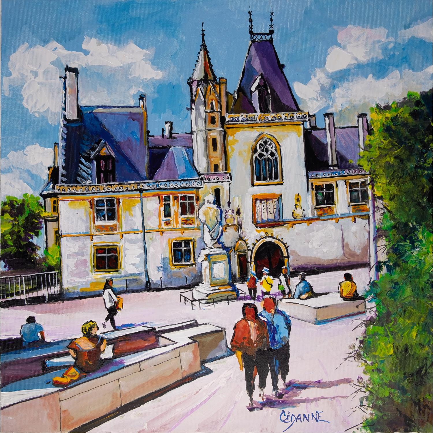 Cette œuvre d'art contemporain unique et originale, de style figuratif, a été réalisée par le peintre Cèdanne. L'artiste a utilisé différentes techniques pour créer cette peinture sur toile, et traiter avec le style singulier qui lui est propre, cette vue du palais Jacques Cœur à Bourges.