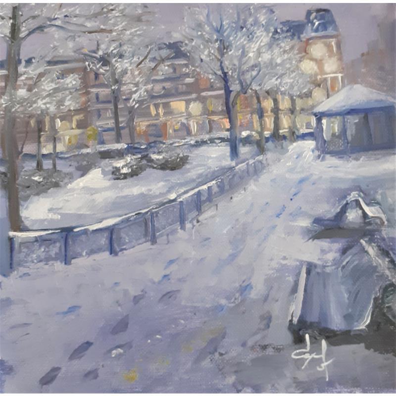 L'artiste a utilisé la technique Huile pour créer cette peinture petit format sur toile de style Figuratif sur le thème Paysage urbain