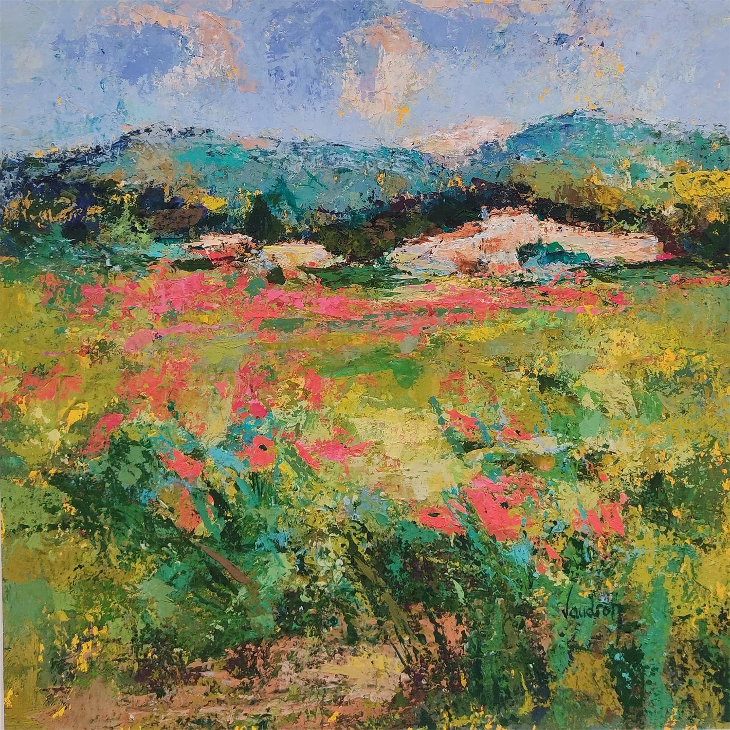 Vaudron, artiste d'origine normande, puise son inspiration dans la beauté des paysages du Luberon, où elle réside aujourd'hui. Son parcours artistique, marqué par une formation aux Beaux-Arts de Caen et une carrière dans la publicité, se traduit par un style figuratif abstrait. Travaillant principalement à la gouache, Vaudron crée des œuvres qui capturent les vibrations de la nature et la lumière méditerranéenne, offrant au spectateur une expérience apaisante et empreinte de douceur.