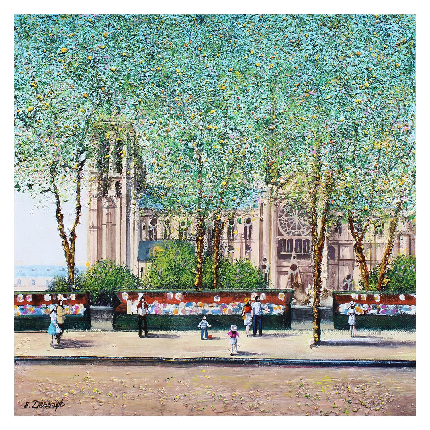 Cette oeuvre d'art contemporain unique et originale "L'été , les bouquinistes et notre-dame" a été réalisée par l'artiste contemporain Dessapt Elika.