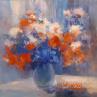 La juxtaposition des couleurs chaudes et froides crée une tension visuelle captivante, qui attire l'œil vers le centre de l’œuvre. La lumière, subtilement suggérée, semble se refléter sur le vase et illuminer le bouquet, ajoutant une dimension d’élégance et de sérénité.