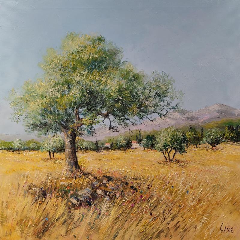 Cette oeuvre d'art contemporain unique et originale "Les oliviers en automne à Dieulefit" a été réalisée par l'artiste contemporain Sannier Daniel.