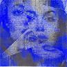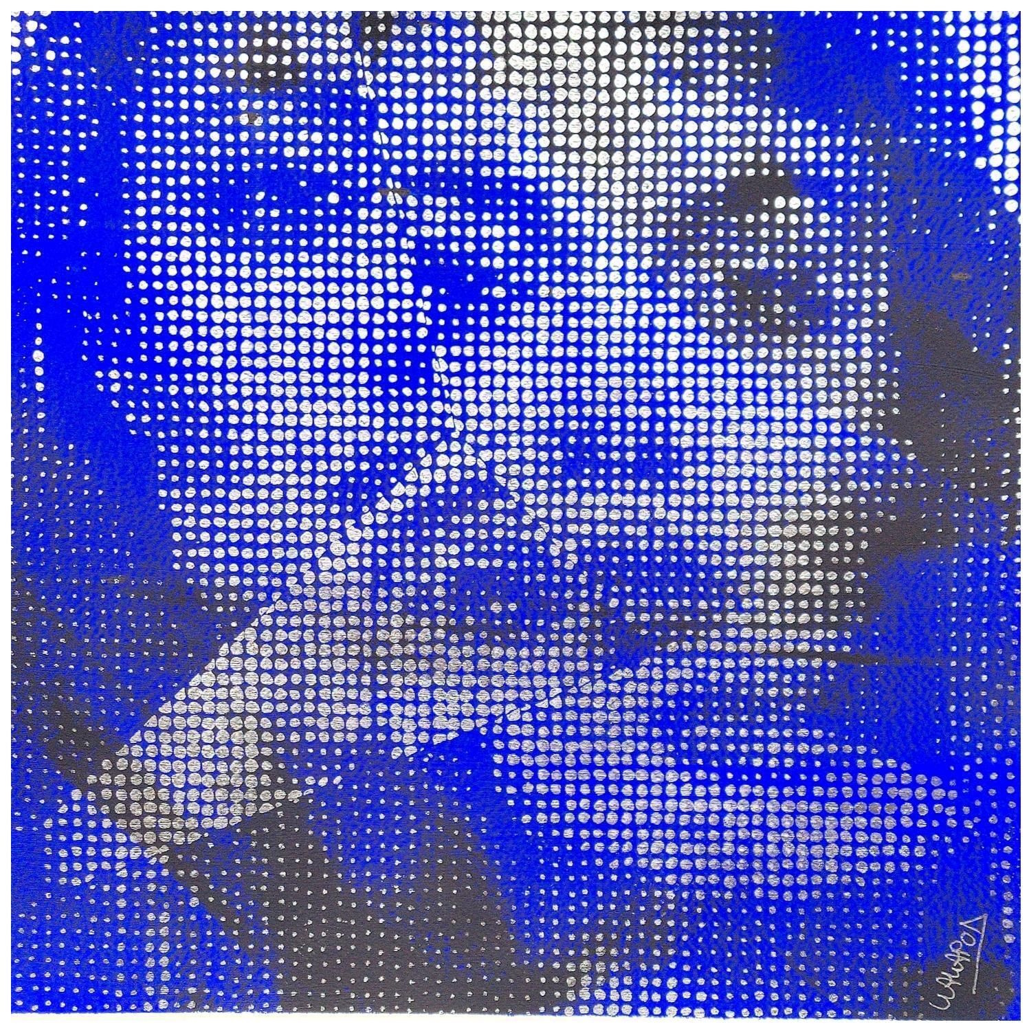L'artiste a ici dressé son portrait en accumulant des centaines points . L'artiste a d'abord travaillé le fond en trouvant un équilibre entre le noir et le bleu klein pour ensuite y ajouter ces points de couleurs argentés miroir .