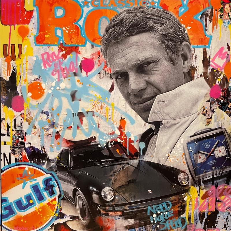 L'artiste a utilisé différentes techniques pour créer cette peinture grand format sur Dibon de style Pop-art sur le thème Icones Pop.