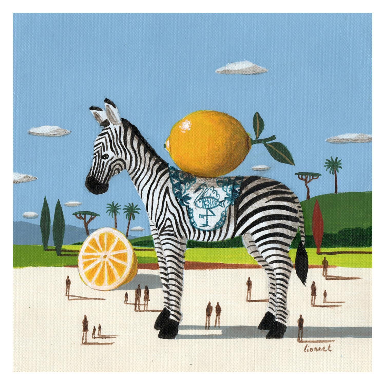 Cette oeuvre d'art contemporain unique et originale "zèbre aux citrons" a été réalisée par l'artiste contemporain Lionnet Pascal.