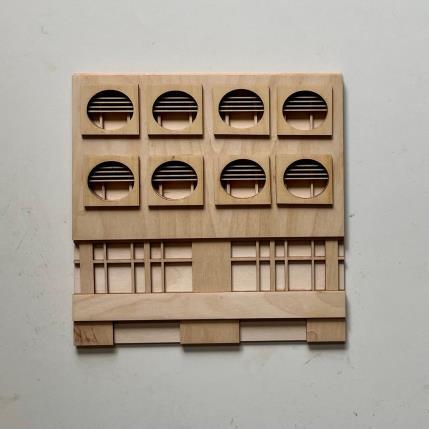 Plyconic crée des œuvres d'art architecturales en 3D utilisant du contreplaqué, inspirée par l'architecture post-guerre et son utilisation novatrice des matériaux. Son processus commence par l'exploration de formes architecturales susceptibles de se traduire en couches de bois. Après avoir esquissé les dessins et déterminé l'agencement des couches, elle découpe le contreplaqué au laser, puis les assemble méthodiquement pour former des tableaux en relief. Cette technique, alliant esthétique pratique et beauté du bois naturel, offre une expérience visuelle apaisante et unique, mettant en lumière la douceur inhérente au grain du bois contre les lignes dures de l'architecture moderne.