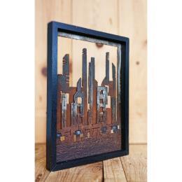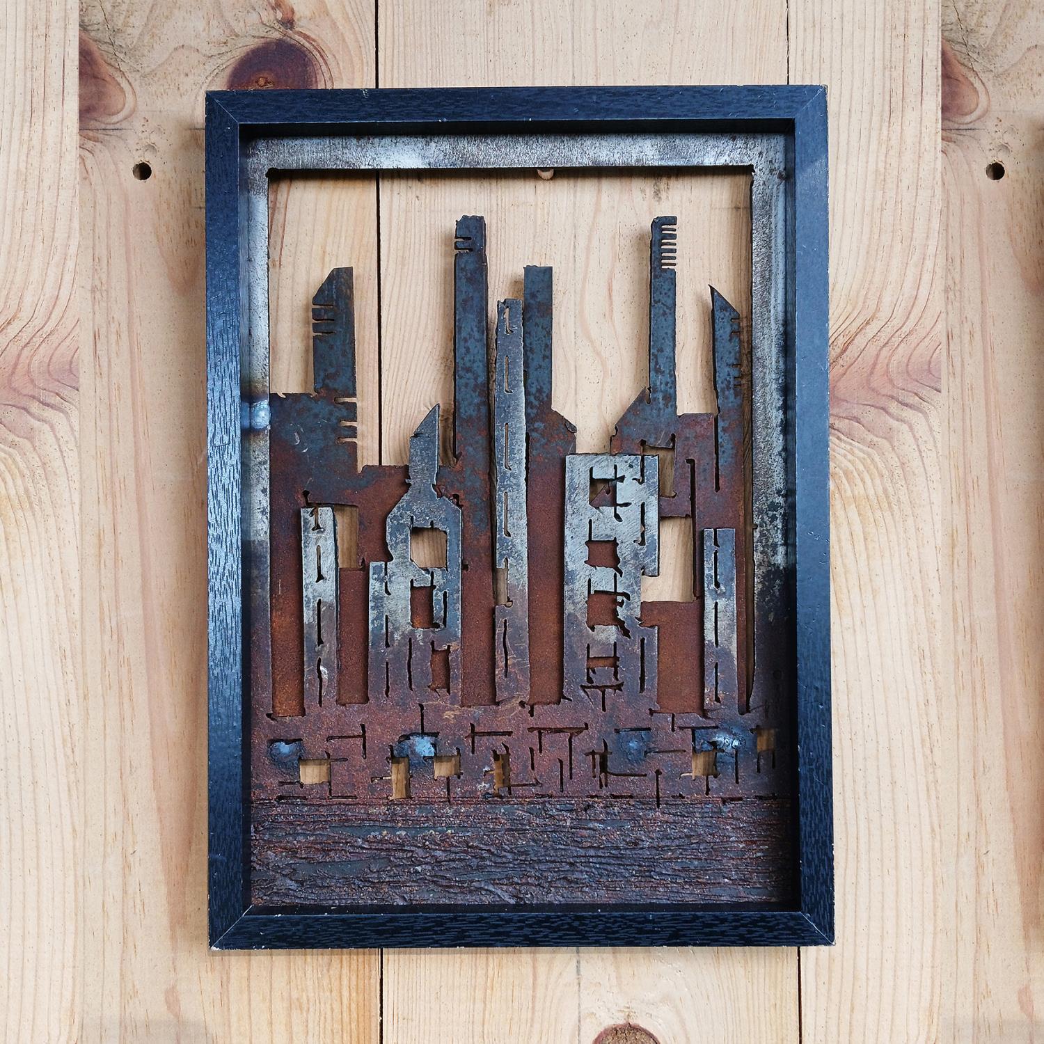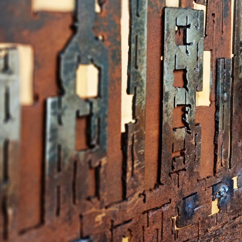 Sculpture murale en acier réalisée avec des plaques soudées à l'arc. L’œuvre est composée de plusieurs patines réalisées par oxydation naturelle et application d'hématite.