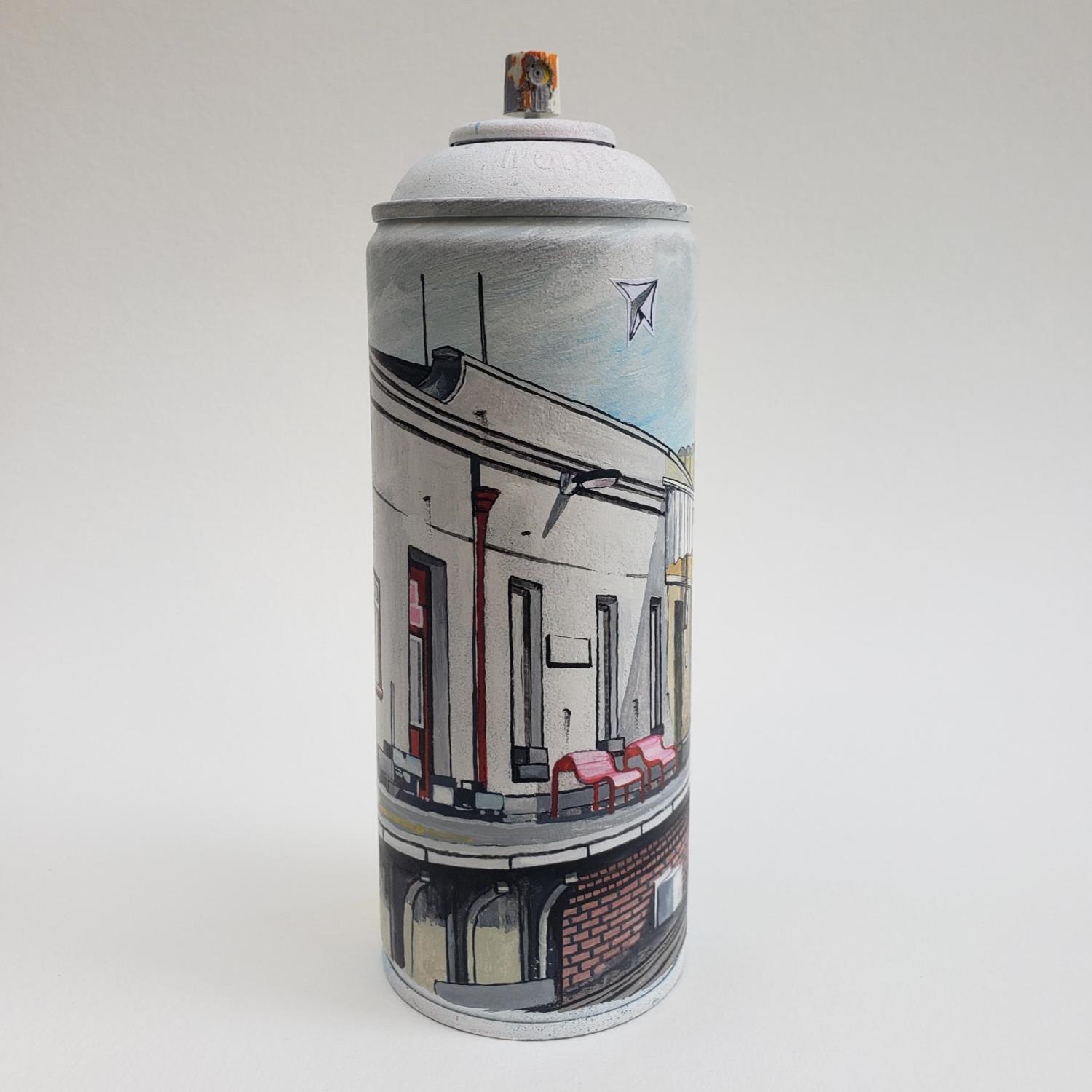 L'artiste a utilisé les techniques Graffiti, Métal, Acrylique pour créer cette sculpture petit format en Métal de style Street Art sur les thèmes Paysages, Urbain, Architecture.