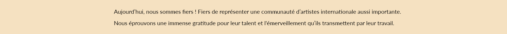 Ce qui nous anime ? Une relation privilégiée avec chacun d’entre eux. Qu’ils soient jeunes ou expérimentés, nous rencontrons des artistes généreux, inspirants et captivants et nous nous efforçons de leur donner une voix, un visage pour faire vivre leur art auprès de clients du monde entier.