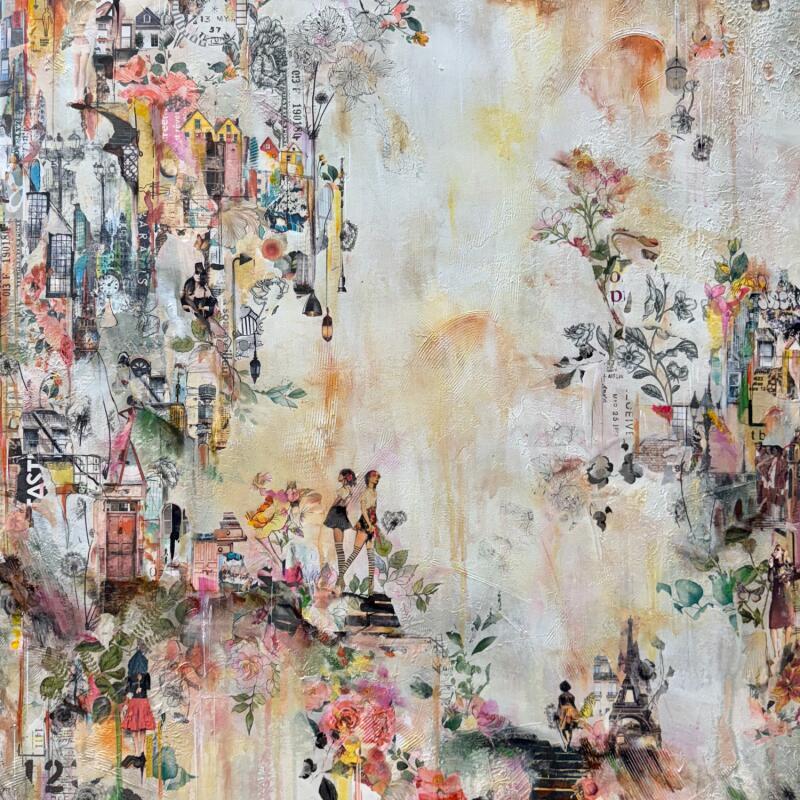 L'artiste a utilisé les techniques mixtes: Collages, textures, pastels et peinture acrylique pour créer cette peinture grand format sur toile de style abstrait et surréaliste.