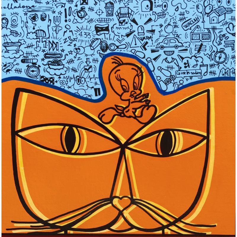 Cette oeuvre d'art contemporain unique et originale "Le chat et l'oiseau" a été réalisée par l'artiste contemporain Belladone.